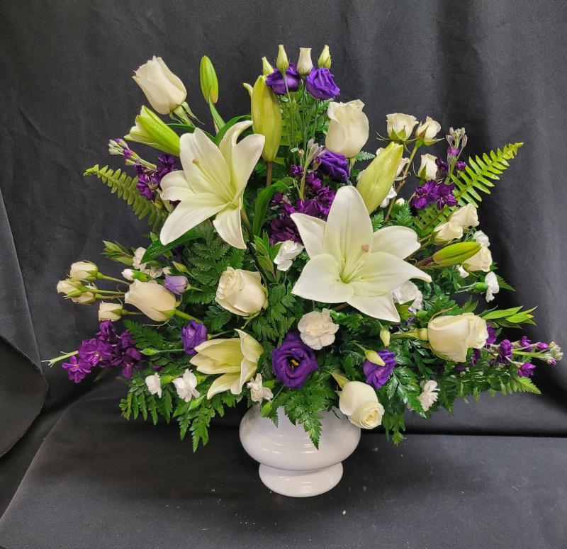 With soft purples and whites our Purple Memories arrangement offers a serene and peaceful tribute for your loved one. White roses, Asiatic lilies, and rich purple lisianthus and stock create a calming presence. Designed in a one-sided presentation, this arrangement is displayed in an urn-style container.