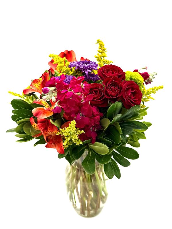 An elegant assortment of ruby-reds, deep purples, and burgundy blooms with a mix of dark emerald greenery to accent. This luxurious palette adds a touch of beauty to any room.