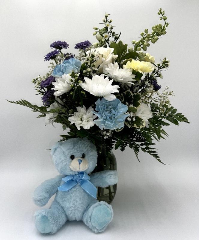 Let our team of designers create a unique arrangement to celebrate the newest addition in shades of blues with a special plush bear!