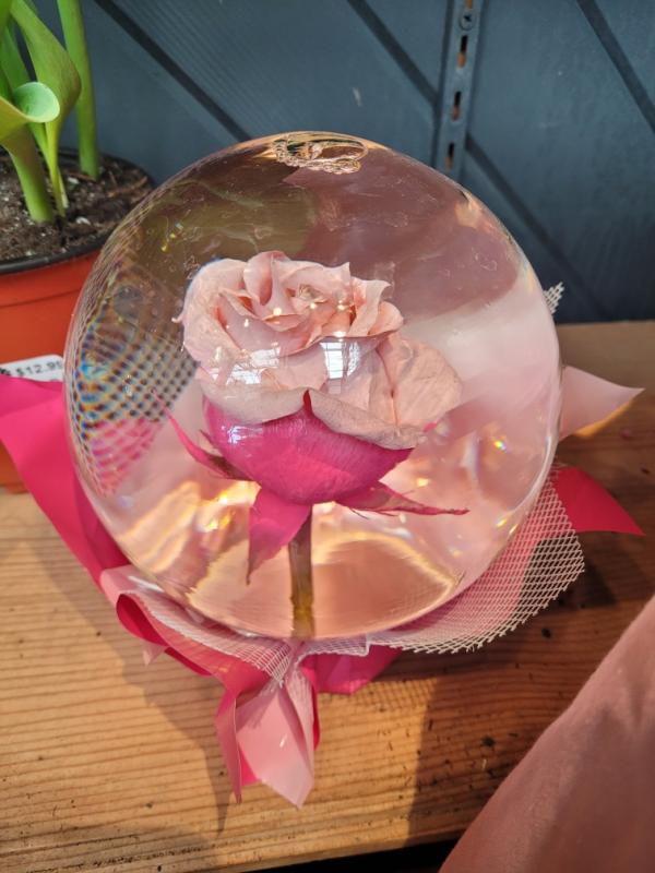 A beautiful rose resting in a water-filled glass globe, making it a unique focal point for your home or office!