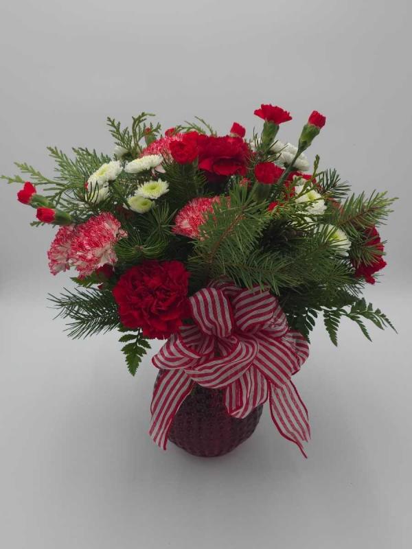 Bright carnations in reds, whites, and peppermint mixed with Christmas greens, accented with bow create a simple, cheerful holiday arrangement.