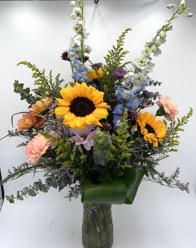 A bright, cheerful mix of yellow sunflowers, paired with carnations and delphinium, a perfect addition to the down-to-earth, aesthetic.